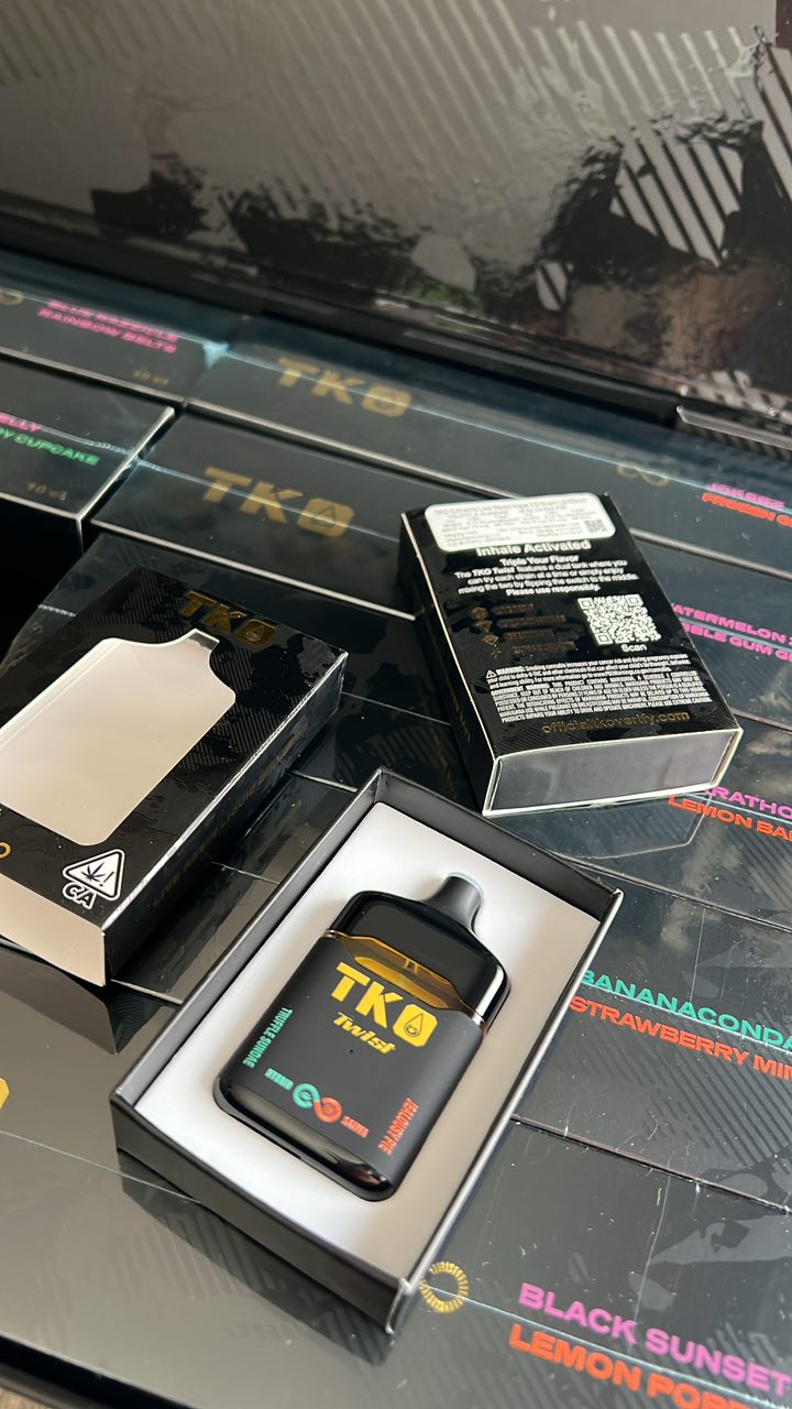 The TKO Extracts Disposable series features a rotating selection of strains, with many TKO Twist devices including popular combinations like: